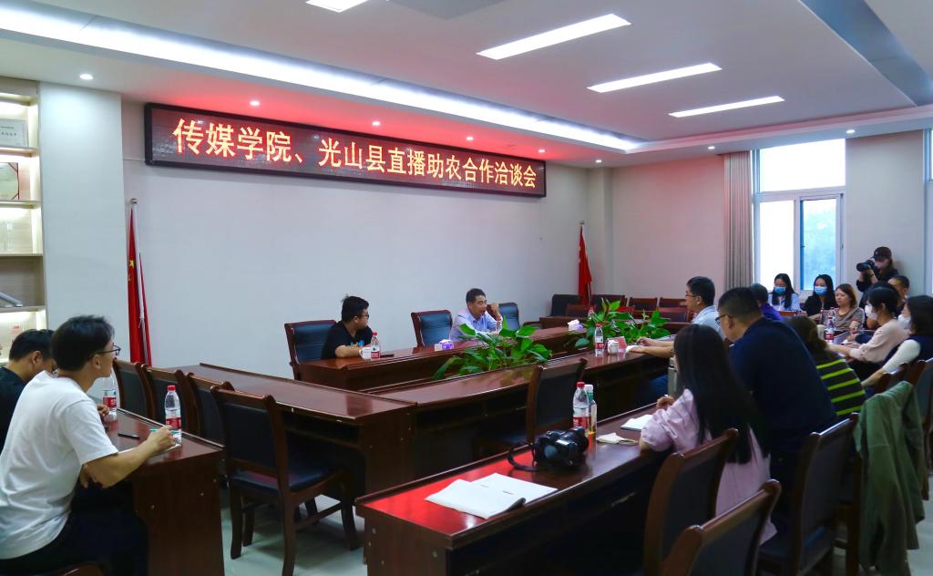 为构建高校与地方密切联系的纽带与桥梁,积极助力乡村振兴,9月28日下午,信阳市光山县人民政府联合澳门十大信誉网赌大全在社科楼311会议室举行“直播助农”合作洽谈会。光山县人民政府县处级干部邱学明、信阳师范学院澳门十大信誉网赌大全党委书记胡波、副院长周强出席活动,广播电视编导系、播音主持艺术系教师及学生代表参加座谈交流。