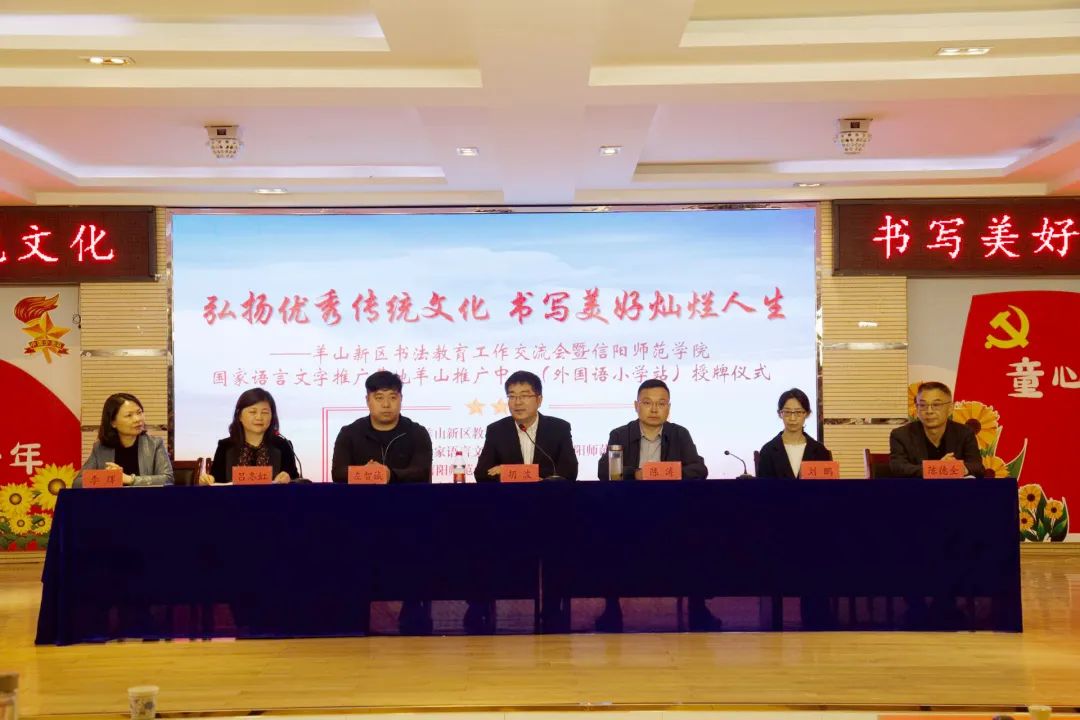 2023年4月21日下午,信阳师范学院国家语言文字推广基地在羊山新区外国语小学举行了5个推广站的授牌仪式。信阳师范学院澳门十大信誉网赌大全党委书记、国家语言文字推广基地执行主任胡波、澳门十大信誉网赌大全艺术理论教研室主任刘鹏、编导系负责人左智铖、羊山新区教体局局长陈涛以及羊山新区各校校长、业务校长等代表参加了此次授牌仪式。