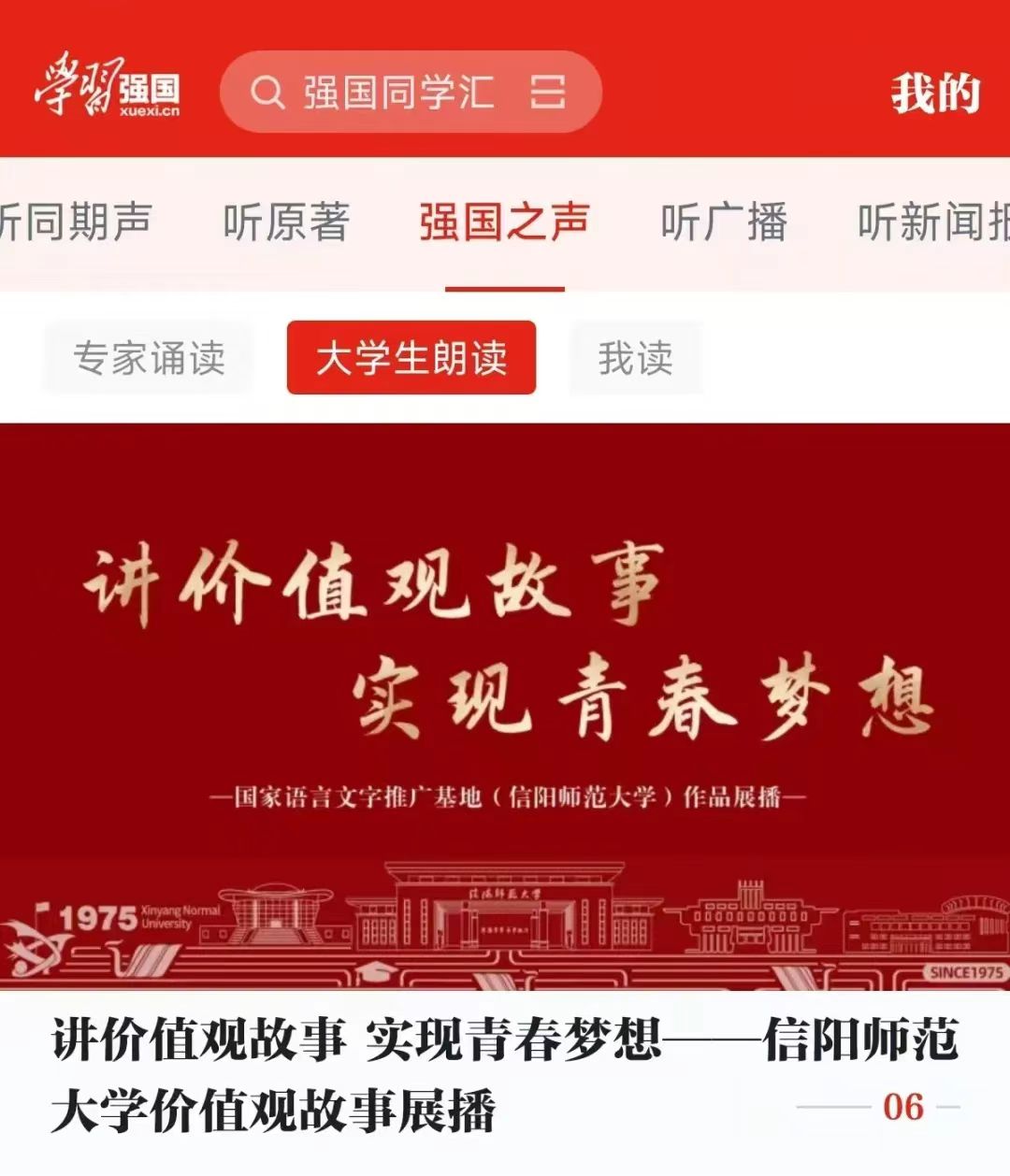 2024年,澳门信誉最好十大平台国家语言文字推广基地充分发挥学科专业优势,积极支持“学习强国”平台建设,精心策划并录制了《讲价值观故事 实现青春梦想——澳门信誉最好十大平台价值观故事展播》系列优质有声作品。作品上线后,深受广大用户喜爱,并荣登大学生朗读频道头版头条。截至目前,作品收听量已高达132万次。