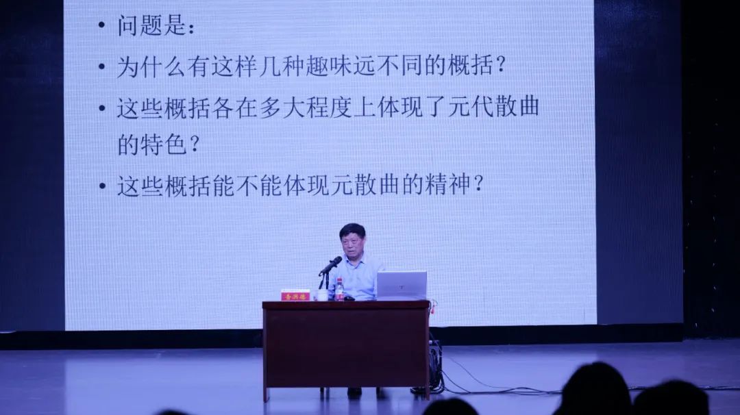 之后,查洪德教授分别解释了“野”“逸”的释义及其在不同场合的运用,道出“野逸”的由来,说明“野逸”蕴含的淳朴闲适、放纵不羁、隐逸的人或隐居生活三个意象,帮助同学们更好了解其内涵。他用不同风格的元散曲和元代诗人向大家举例说明元散曲“野逸”之趣的七种表现形态:狂野肆逸、疏野旷逸、朴野恣逸、乡野恬逸、闲野俊逸、野思逸想、俚野荒逸,并将其实质内涵与现代生活的各方面相结合,加深同学们的理解。