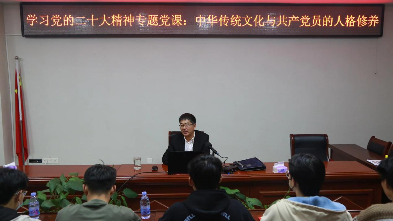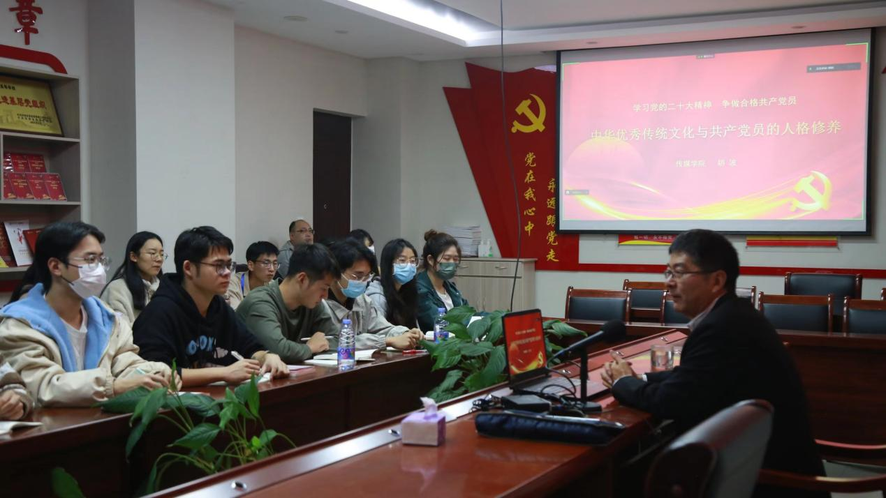 会上,胡波书记以“学习党的二十大精神,争做合格共产党员”为主题,以“中华优秀传统文化与共产党员的人格修养”为切入点,从“谦虚谨慎”、“积极作为”、“自我反省”、“多公少私”、“以德为先”、“善于学习”、“模范带头”、“遵守纪律”、“忠诚老实”“平等待人”十个方面引经据典,并结合大量自身实践经验,深入阐述了党的二十大精神的丰富内涵和指导意义,为大家成为一名合格的共产党员提供了思想引领和实践指导。他指出,在党的二十大上,习近平总书记提出的“两个结合”达到了更新的理论层次,更加着重的强调了中华传统文化的优越性,对于当代学生党员实现自我净化、自我完善、自我革新有着极高的参考价值。中华优秀传统文化是古人的智慧结晶,蕴含着丰富的为人处世之道,对于党员注重人格修养、规范自身行为有着深刻的教育意义。