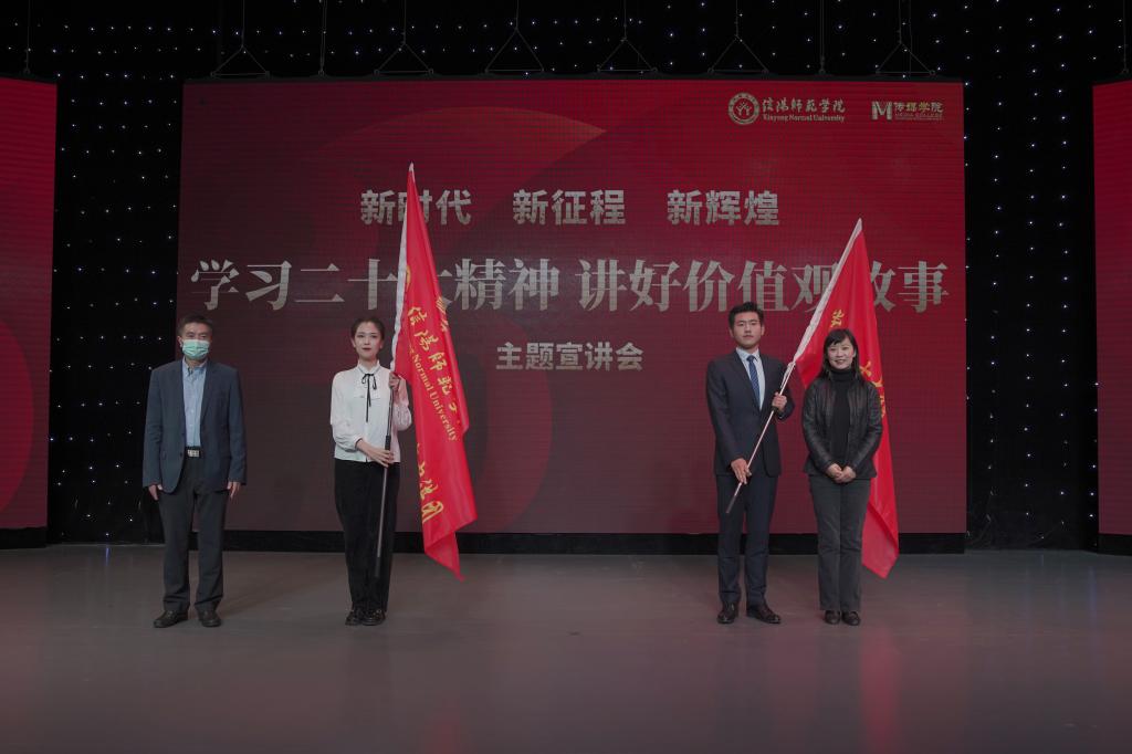 11月24日,我校国家语言文字推广基地、澳门十大信誉网赌大全联合举行“学习二十大精神,讲好价值观故事”主题宣讲会,副校长余本海、王娟出席宣讲会并为“党的二十大精神青年宣讲团”、“价值观故事宣讲团”代表授旗。宣讲会以线上线下相结合的方式举行,校语委、教务处、澳门十大信誉网赌大全负责同志及师生代表共同出席。