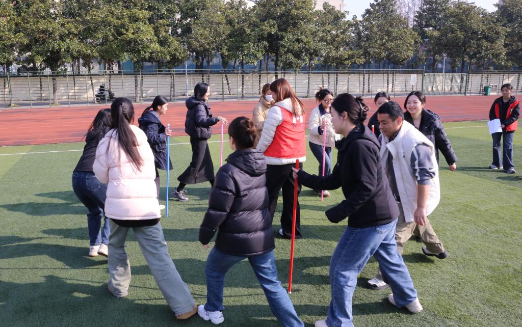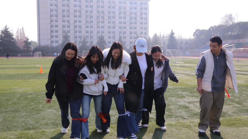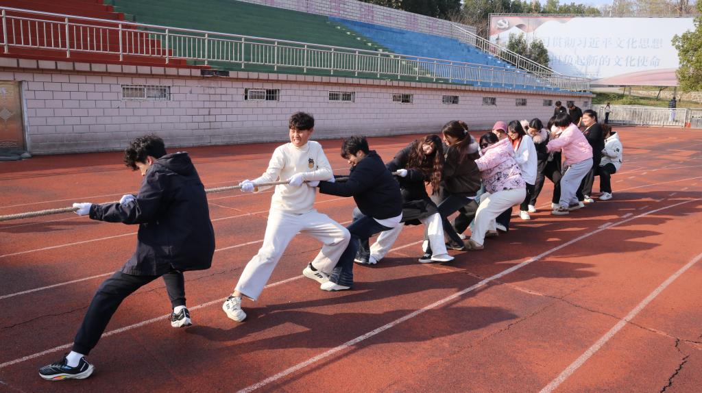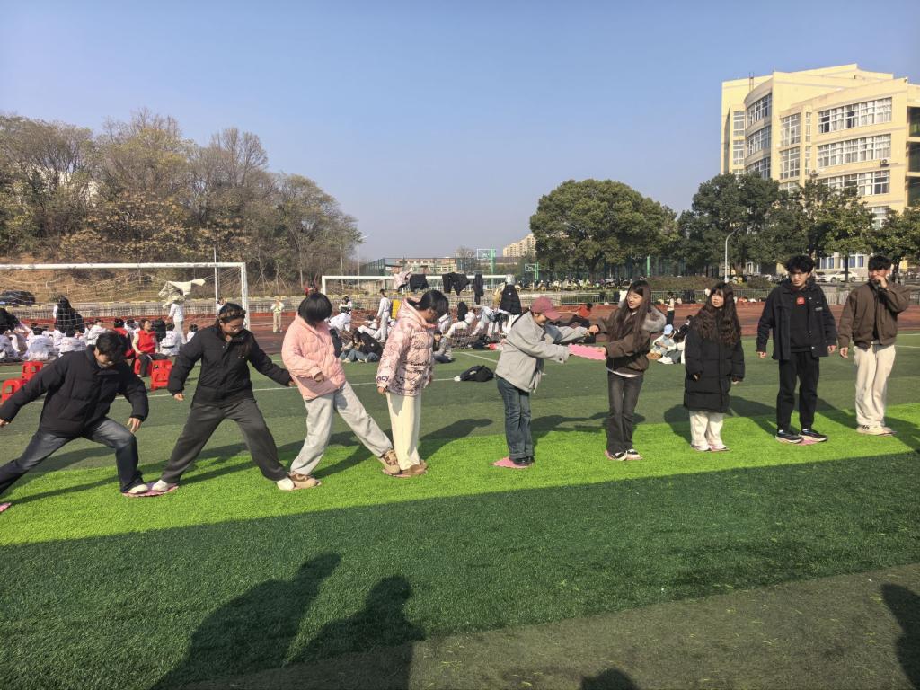 活动设置了“五人四足”“不倒森林”“搭桥过河”“抢凳子”“拔河”五项兼具趣味性与协作性的项目。在“搭桥过河”中,同学们精准衔接、快速推进;在“五人四足”中,共同研究提速方法,聚力同心、默契配合;“不倒森林”和“抢凳子”项目紧张刺激、笑声不断。压轴的“拔河”比赛将现场气氛推向高潮,呐喊声、助威声此起彼伏,展现出学生们不服输、勇拼搏的青春底色。