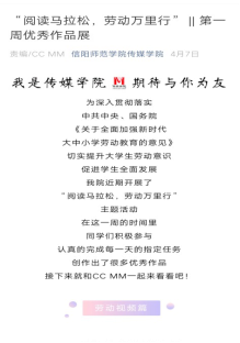 此次活动秉承教育性、开放性、自主性,以丰富学生课余生活、提高学生阅读热情和文化素养、培养学生热爱劳动、吃苦耐劳精神为目的,面向信阳师范学院澳门十大信誉网赌大全全体学生展开。此次活动内容主要有推荐一本好书、每天阅读一小时、“劳动万里行”主题海报设计比赛、争做家务能手、分享生活小诀窍、社区志愿服务、开展劳动教育课程等。在注重文化学习同时注重劳动教育,是提高学生劳动精神面貌,引导学生正确劳动价值取向的有利举措。