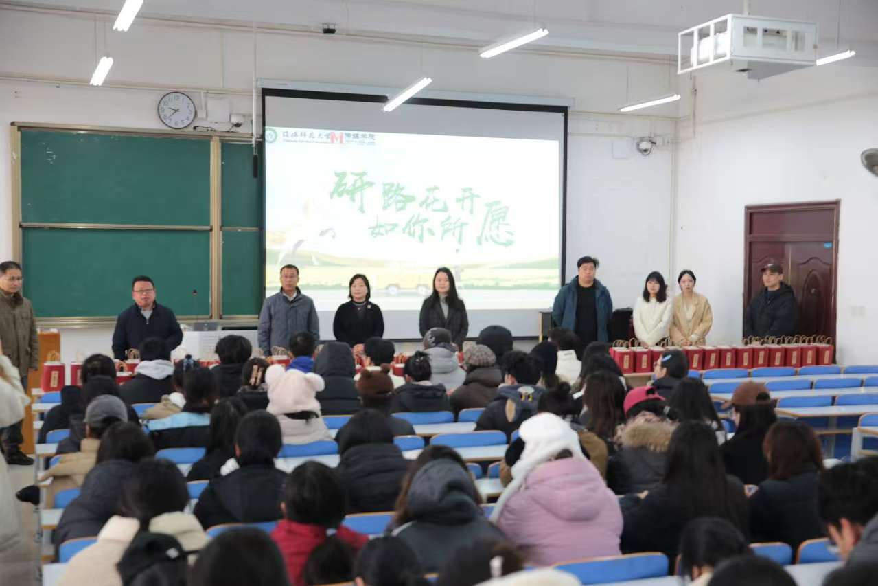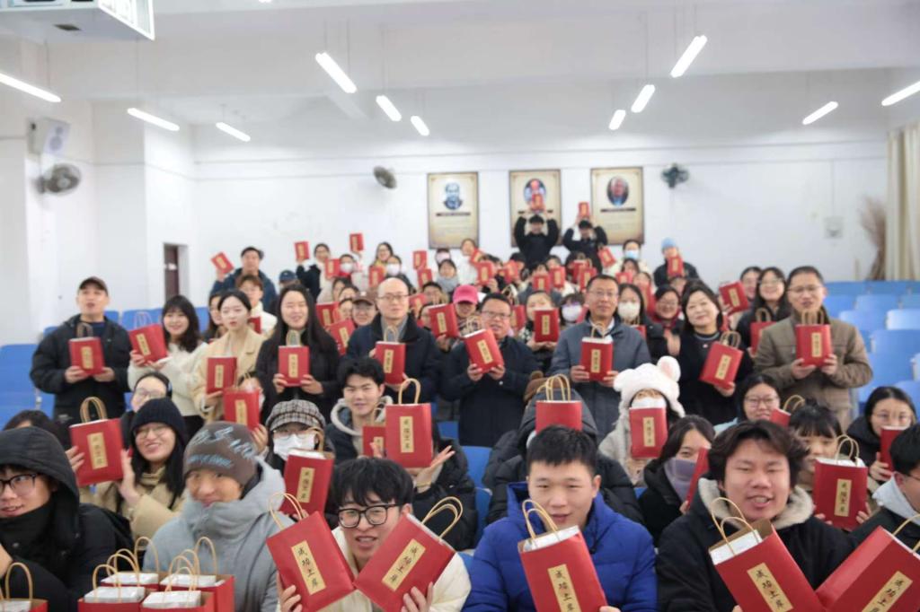 学院领导班子成员、毕业生班主任向考研学生发放“成功上岸”暖心礼包并合影留念。(审核:辛文迪、余艳楷)