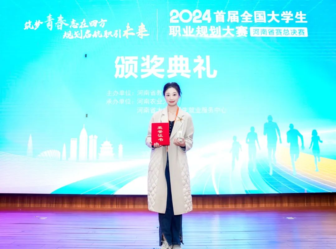 3月14日,首届全国大学生职业规划大赛河南省赛总决赛暨颁奖典礼在河南农业大学圆满落幕,我校4名参赛选手斩获高教组金奖2项、银奖2项,学校荣获“优秀组织奖”。