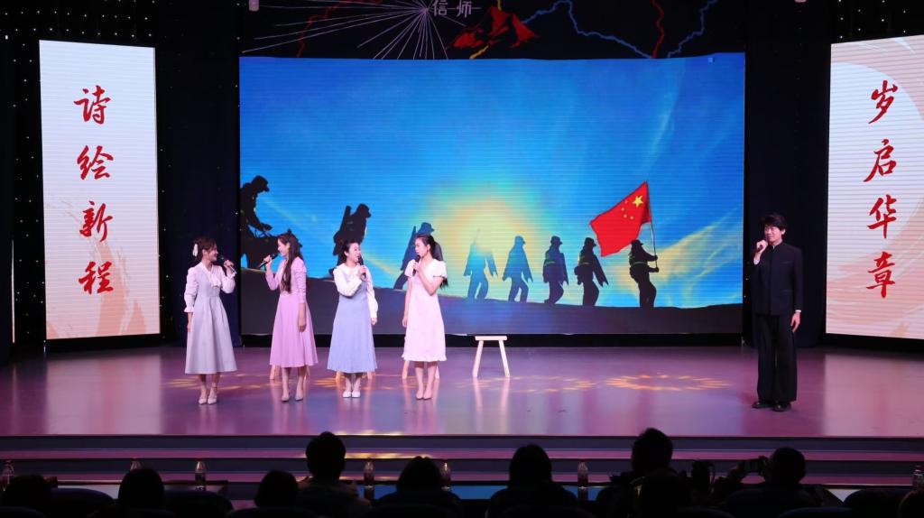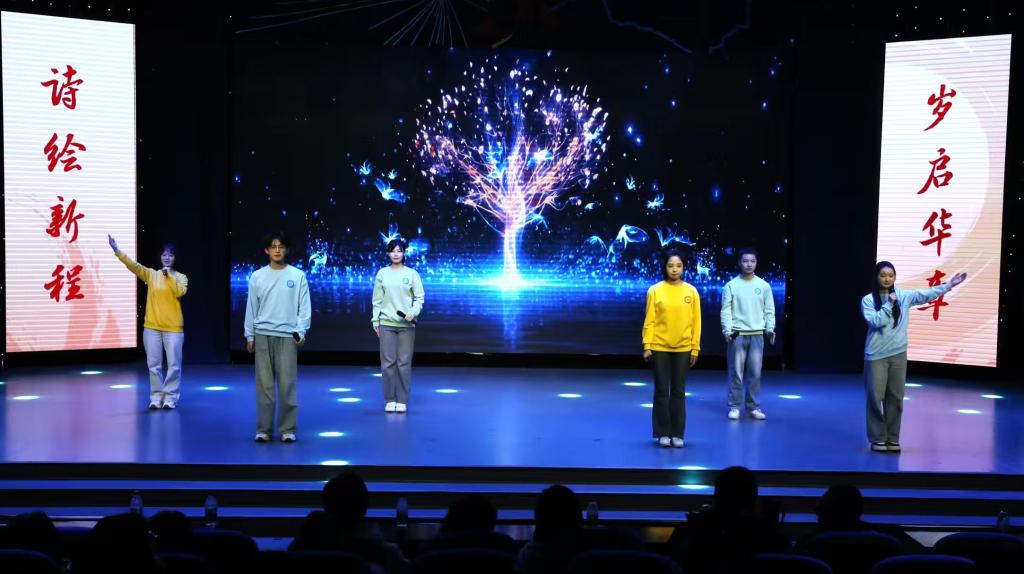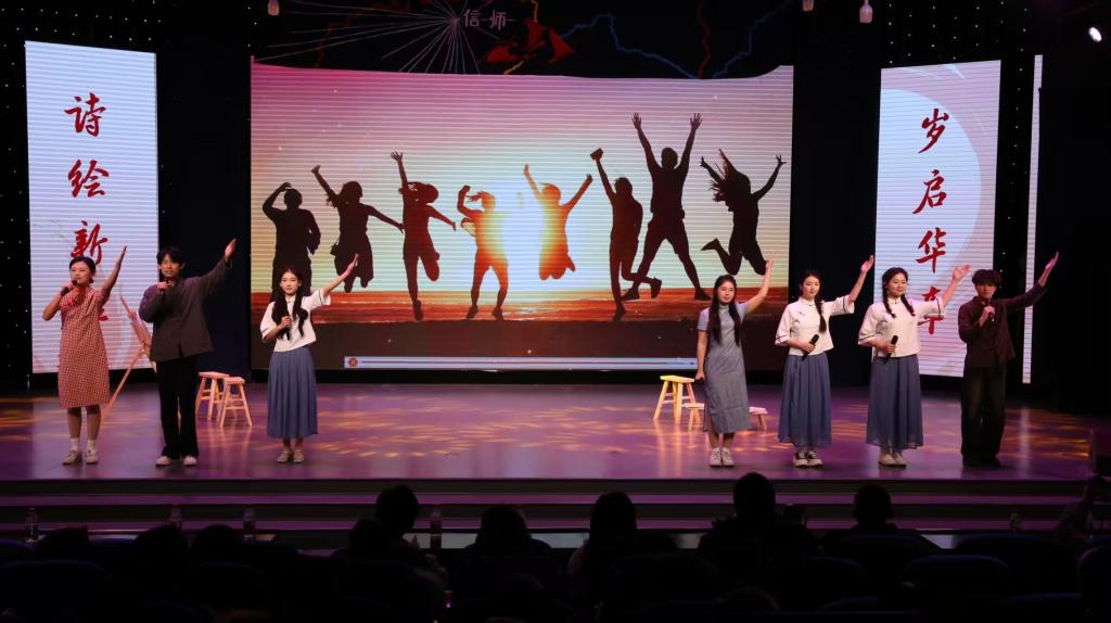 诗会在气势恢宏的《时间的入口》中拉开帷幕,铿锵有力的诵读如晨钟叩响新年的序章,象征新时代青年立于时代潮头的坚定信念。随后,《火把》《闪耀吧!青春的火光》《青春的油灯》等作品依次登台,或炽烈如炬,照亮前行之路;或温润如灯,映照奉献初心,生动诠释了不同时代中国青年矢志报国的精神图谱。《西去列车的窗口》以深沉语调再现上世纪青年奔赴边疆、投身建设的豪迈壮志;《那一年,中国青年正十八》则将观众带入百年前风云激荡的觉醒年代,唤起对民族复兴初心的深切共鸣。《青春万岁》以饱满的热情与整齐的节奏,将现场氛围推向高潮,掌声经久不息,传媒学子们以饱满的热情和富有张力的演绎,将文字化为声音的力量,在辞旧迎新之际奏响属于新时代青年的精神强音。