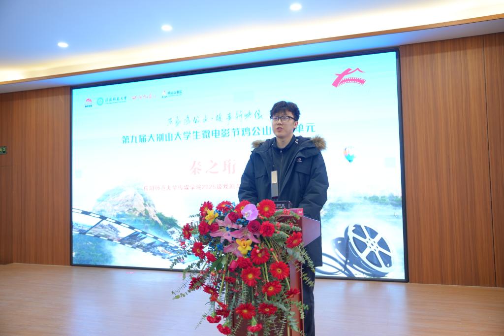 澳门十大信誉网赌大全2025级戏剧与影视专业研究生秦之珩作为学生代表发言,表达了参赛学子深耕创作、用心诠释鸡公山文化魅力的决心,承诺将以严谨的创作态度和饱满的创作热情,深入采风、精心打磨作品,力求用优秀的影像成果展现专业素养,不负各方期待。