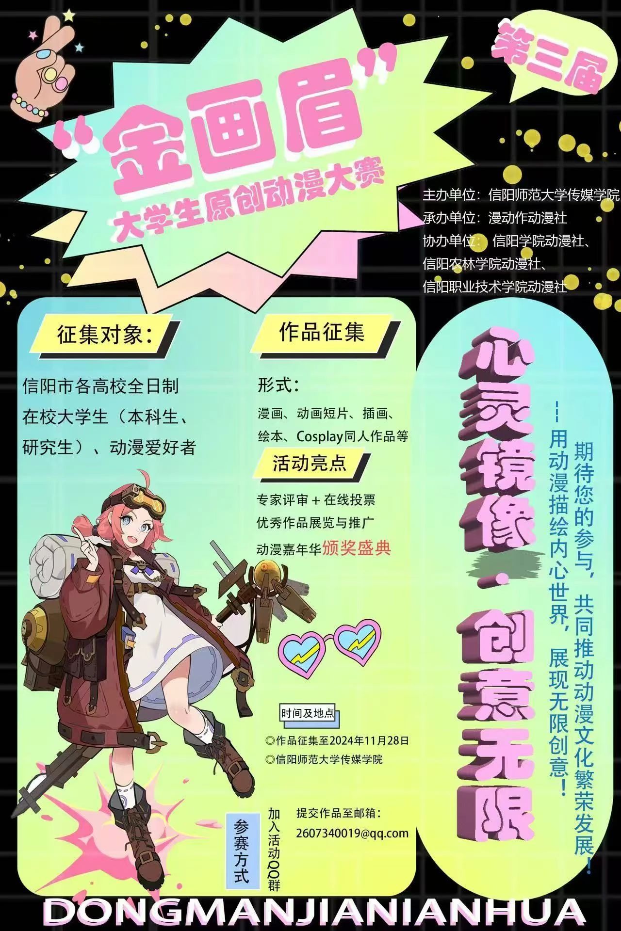 我们诚挚邀请信阳市区各高校的专业同学和动漫爱好者积极参与2024“心灵镜像·创意无界”第三届“金画眉”大学生原创动漫大赛,用动漫描绘内心世界,展现无限创意。期待您的精彩作品!让我们共同推动动漫文化的繁荣发展,为动漫艺术的传承与创新贡献一份力量!(审核:彭勃、李诗雨)