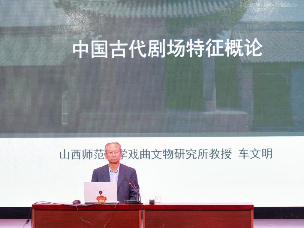 讲座伊始,车文明教授就“剧场”一词的概念及理解进行分析,引出本次讲座主题“古代剧场特征”。随后,他详细介绍了古代剧场的商业性剧场、神庙剧场、宫廷剧场、王公贵族私家园林剧场和临时性剧场这几种类型,并结合图片实例展示。紧接着,他又介绍了各个时期的古戏台建筑,感受不同时期的历史文化变迁及建筑风格改变。讲座最后,车文明教授通过对比中西方不同的剧场特色进行分析,让同学们更加清楚了解古代剧场的特征和独特魅力以及古代劳动人民的智慧。
