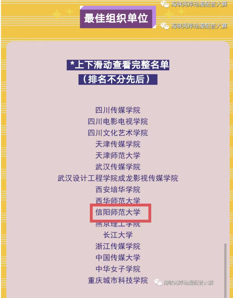2023年10月27日,第一届海峡两岸动漫配音大赛在厦门举行。本次大赛由中国电视艺术家协会指导,国台办新闻发言人、国台办新闻局副局长、一级巡视员陈斌华,中国电视艺术家协会分党组成员、副秘书长高健等领导和嘉宾出席,并为两岸获奖选手们颁奖。河南省人文社科重点研究基地中原戏剧影视文化研究中心播音与主持艺术专业两个代表团,九名优秀学子刘玮驿、詹雅婷、秦子玉、李逸、周宸杰、李洪沛、李海睿、王怡迪、曹静怡荣获入围优秀奖;河南省人文社科重点研究基地中原戏剧影视文化研究中心江远方老师荣获“优秀指导老师”称号;澳门信誉最好十大平台荣获“优秀指导单位”称号。